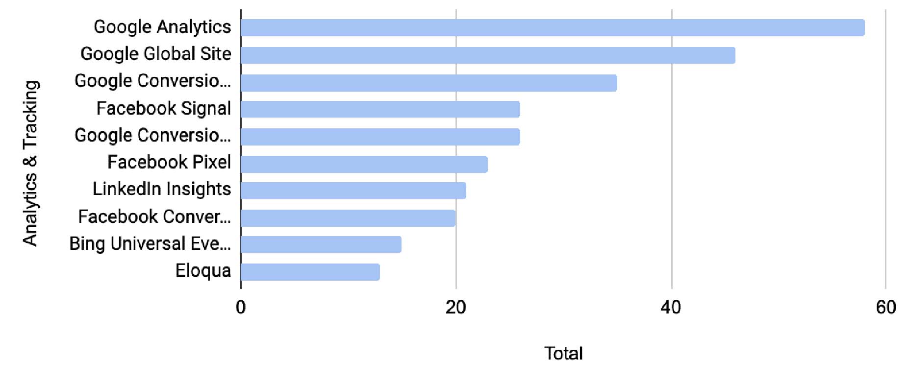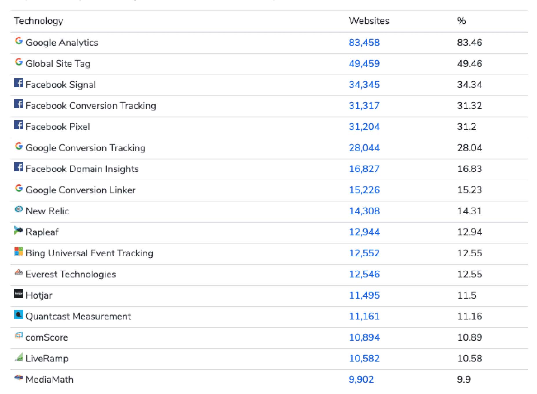 As a whole, everyone pretty much uses Google Analytics, and they often use Google Conversion Tracking with it. Beyond that, if you’re doing Facebook advertising, then Facebook pixels are a must. Aside from these two, NewRelic, Rapleaf (now TowerData), LiveRamp, and Hotjar are probably the most relevant in this conversation.