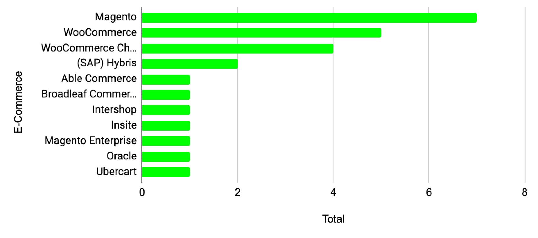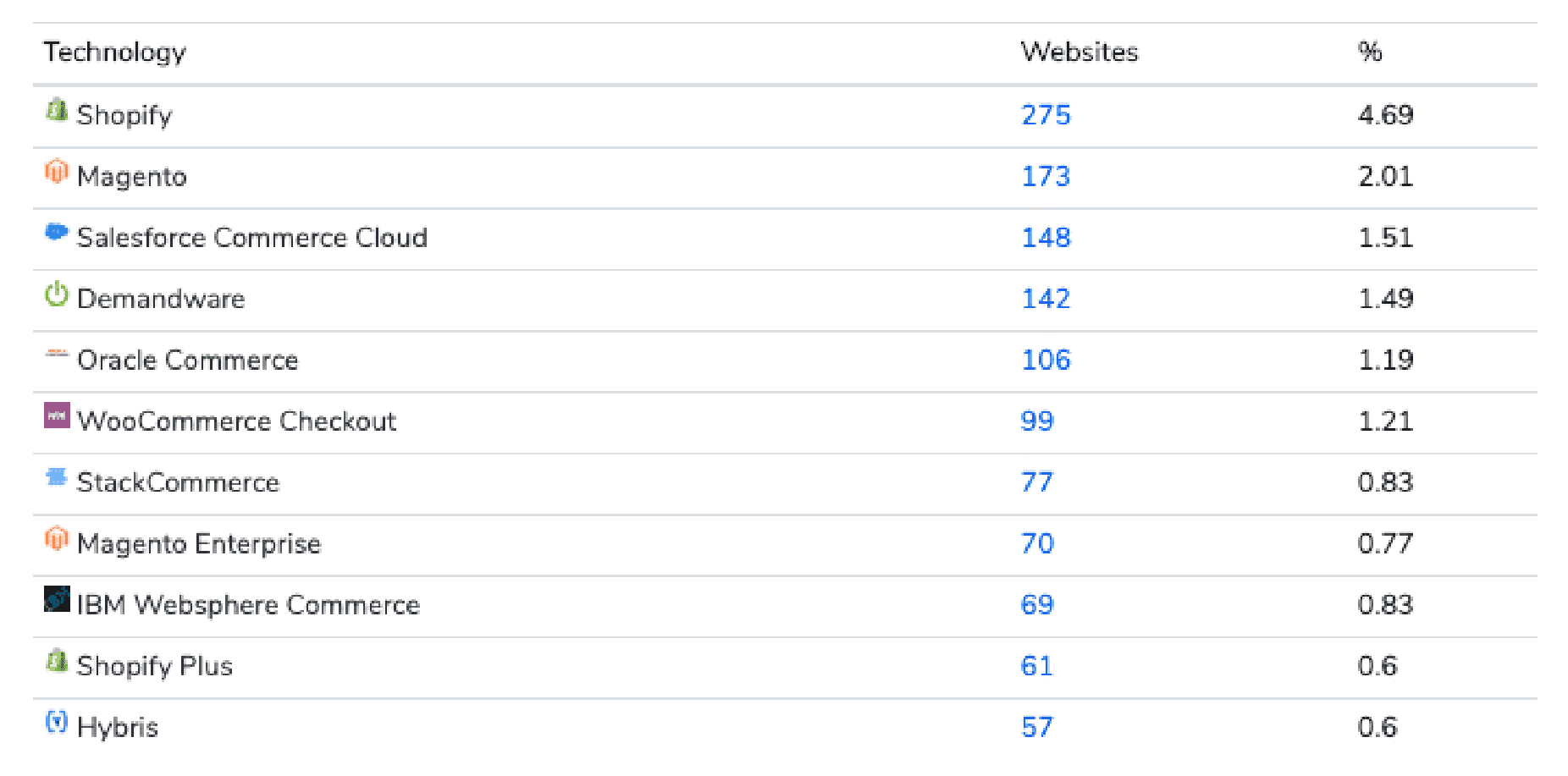 Dark horse: Salesforce Commerce Cloud (Demandware). Salesforce Commerce Cloud, although not adopted in the life sciences space due to significantly higher costs and a lower degree of flexibility and agility, is one of the most popular enterprise-level eCommerce platforms. It is at position #3, right after Magento.