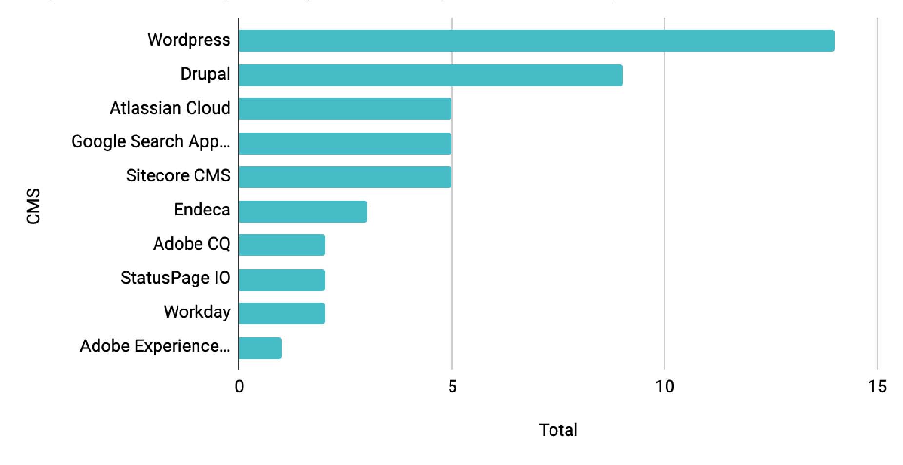 WordPress leads in this category, which is no surprise. Drupal comes in at second, both globally and for life science companies. Sitecore CMS is the only other content management system that is in the running in the life science industry. WordPress and Drupal are both open-source, free-of-charge for anyone, anywhere. Sitecore CMS is a proprietary platform that is built by a privately-held company with some nice built-in digital marketing features that Drupal and WordPress lack out-of-the-box.