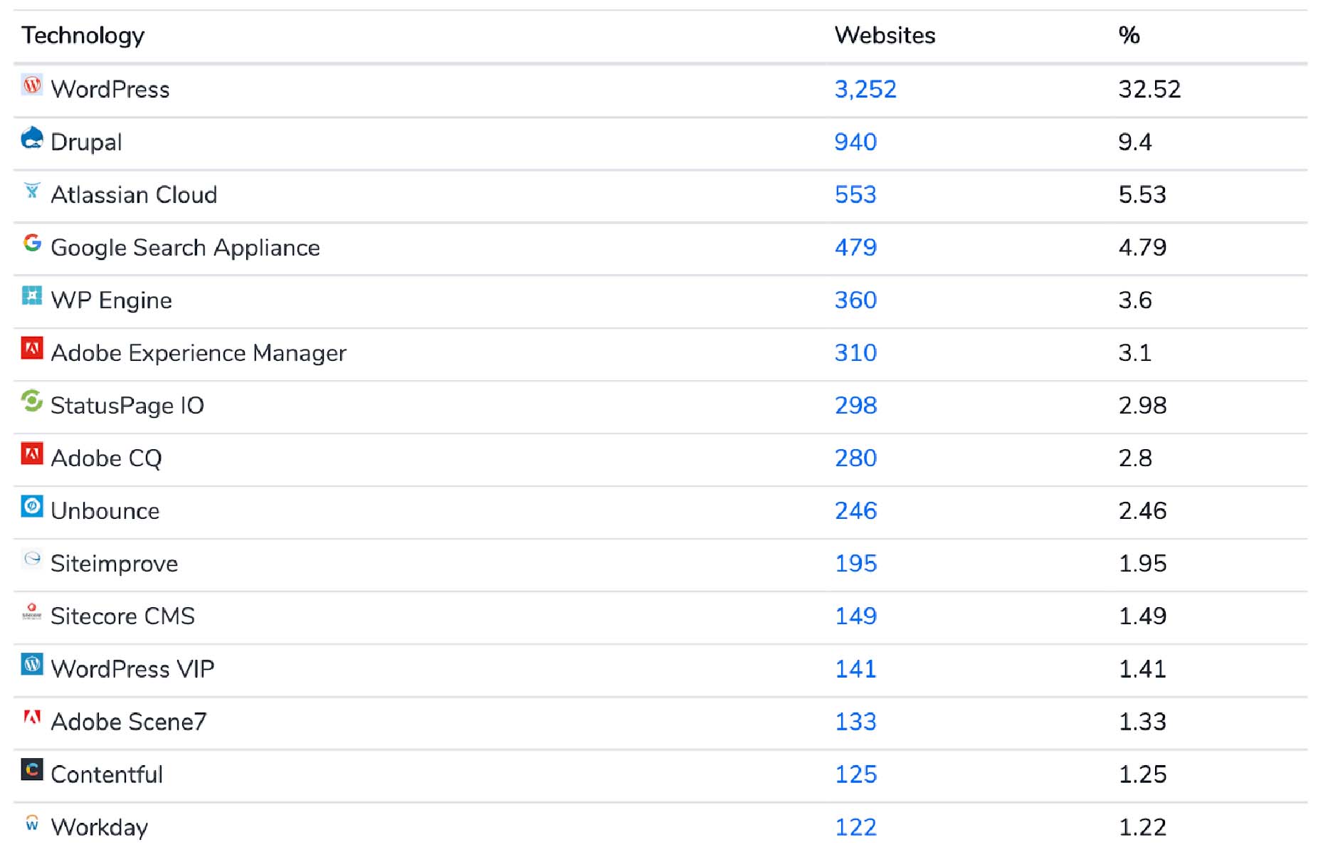 You’ll notice there are a number of other technologies that are grouped into content management systems that will support content management. But they can often be misclassified. The key players are really WordPress, Drupal, Adobe Experience Manager/Adobe CQ, and Sitecore CMS.