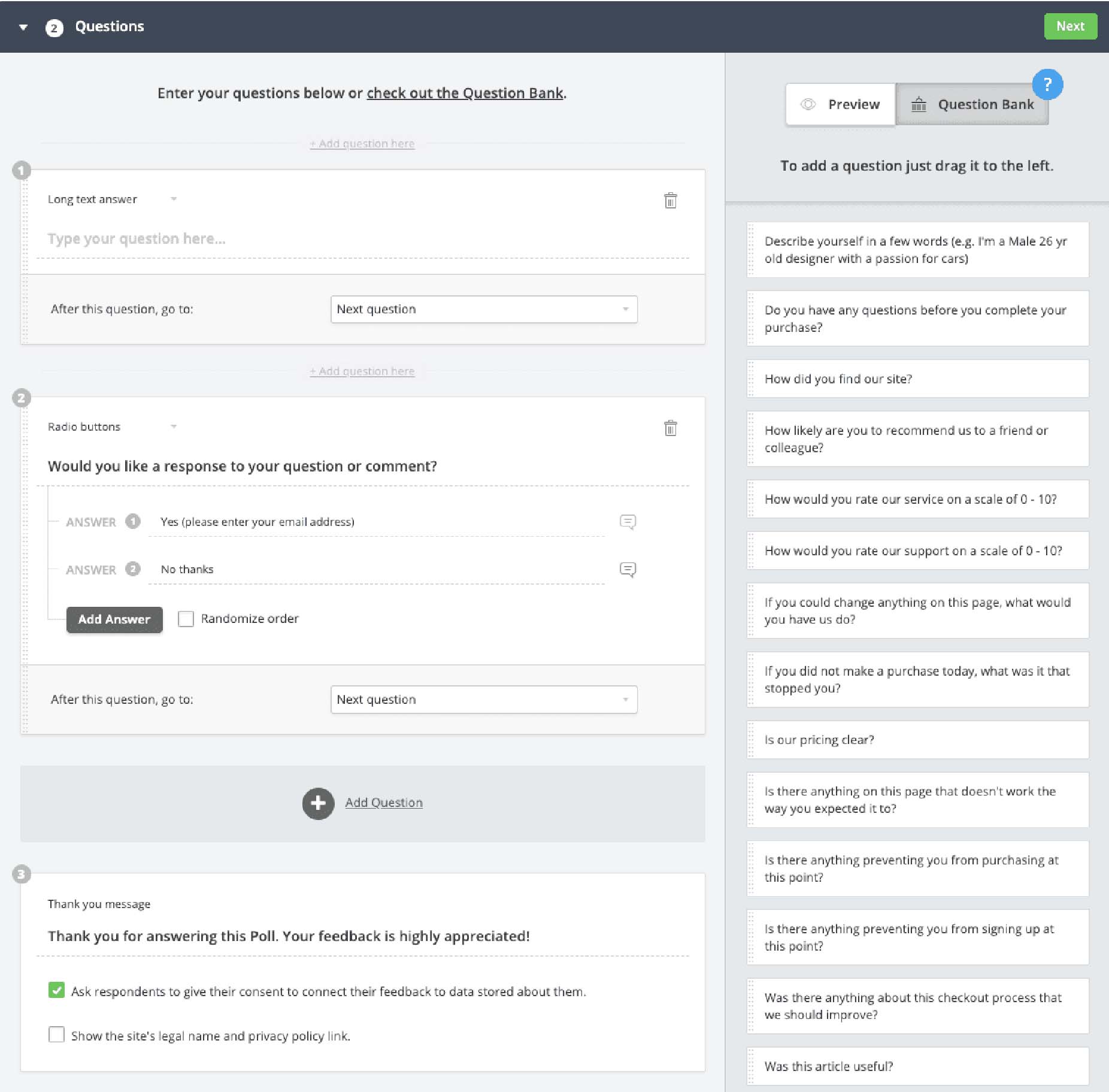 Hotjar has the amazing ability to easily collect user feedback from your website through a simple installation. They even offer a full question bank to help get you started.